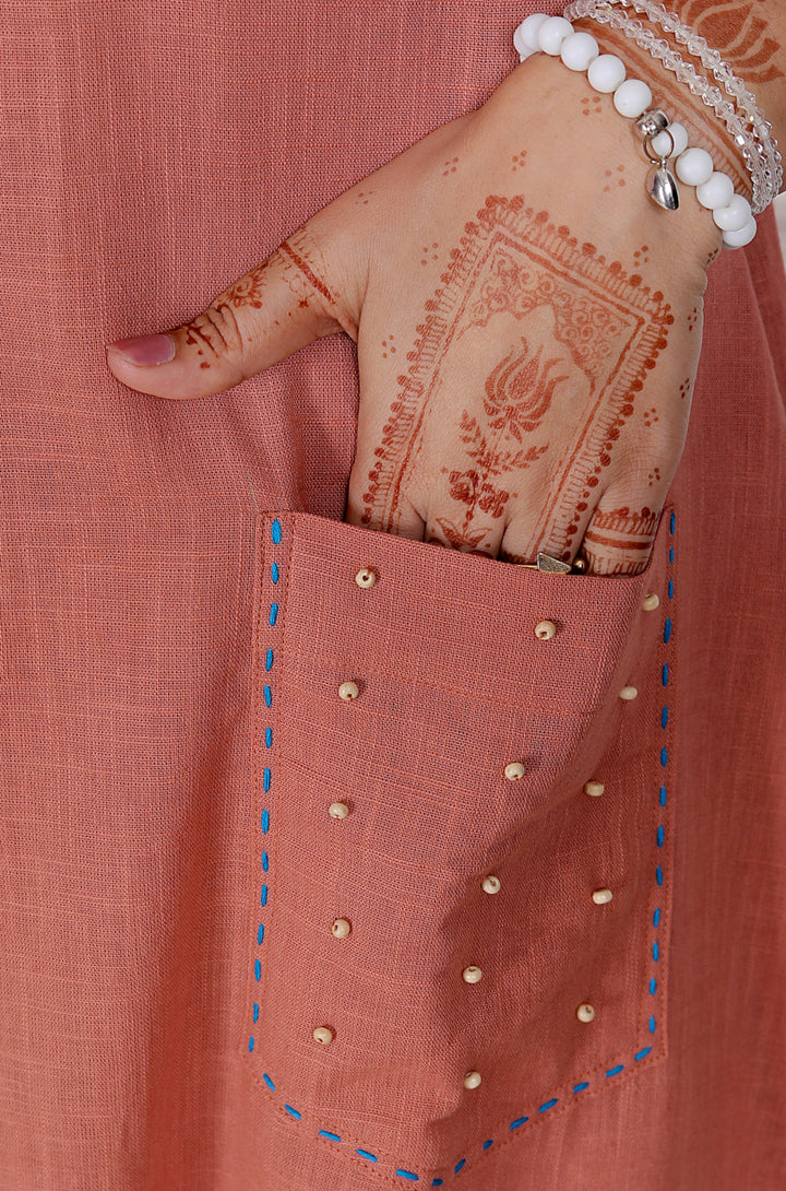 This Kurta has Hand attached wooden pearl beads along the neck and pockets giving it the Elegant Traditional touch.